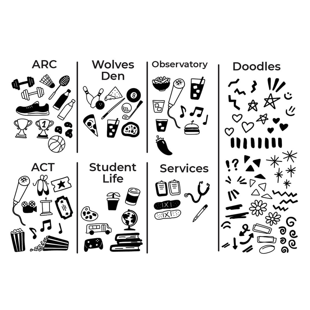 After many and many pages of marker sketches, it was time to move to a digital space. Every hand drawn illustration was traced over in Procreate to ensure it did not lose it’s hand drawn nature, and then was vectorized in Illustrator. Aligning with the mission to better highlight our services across campus, each department or location of significance had their own unique set of icons to show off what they do.